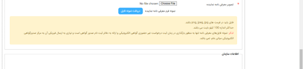 - اطلاعات نماینده را وارد کنید و فایل تصویر معرفی نامه نماینده را بارگداری نمایید.