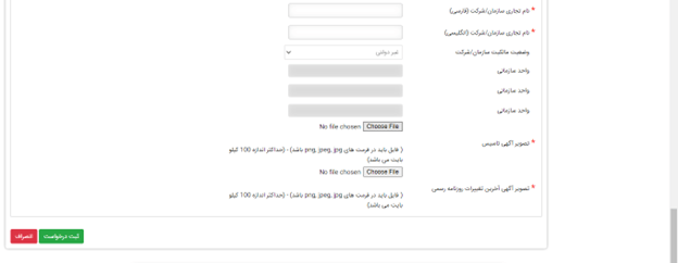 2. اطلاعات سازمان را وراد کنید و فایل تصویر آگهی تاسیس و تصویر آخرین تغییرات روزنامه رسمی را بارگذاری نمایید.