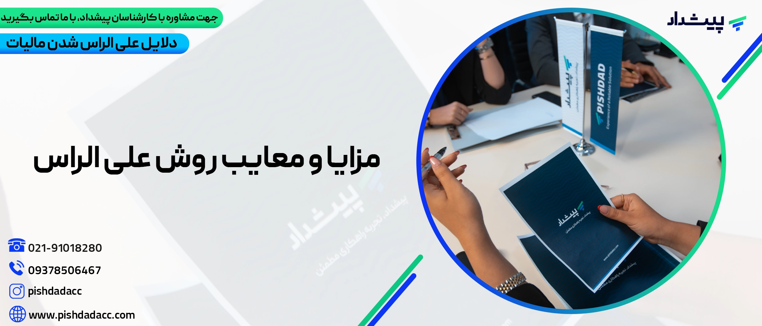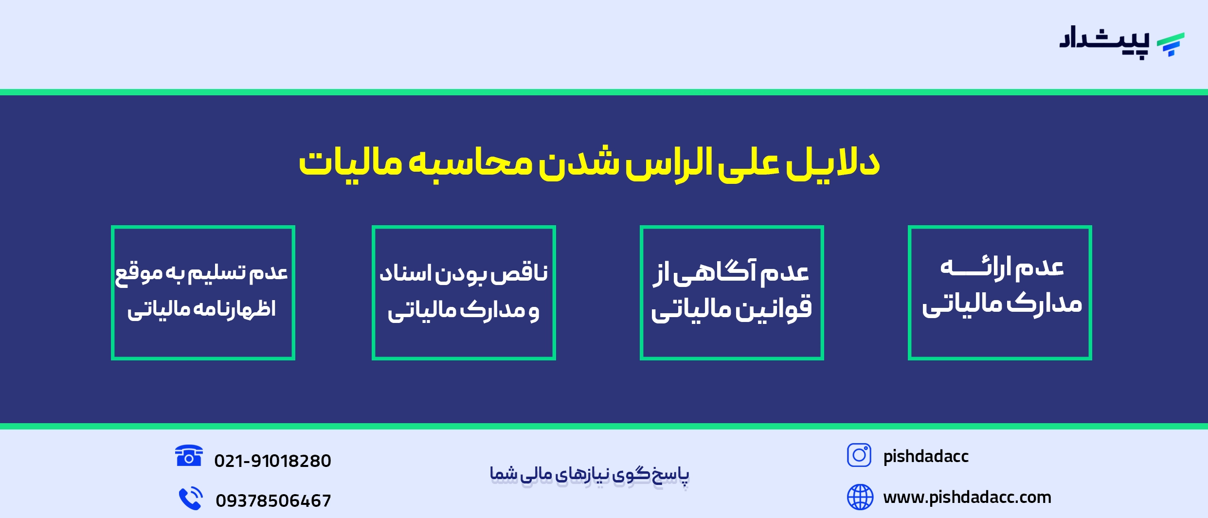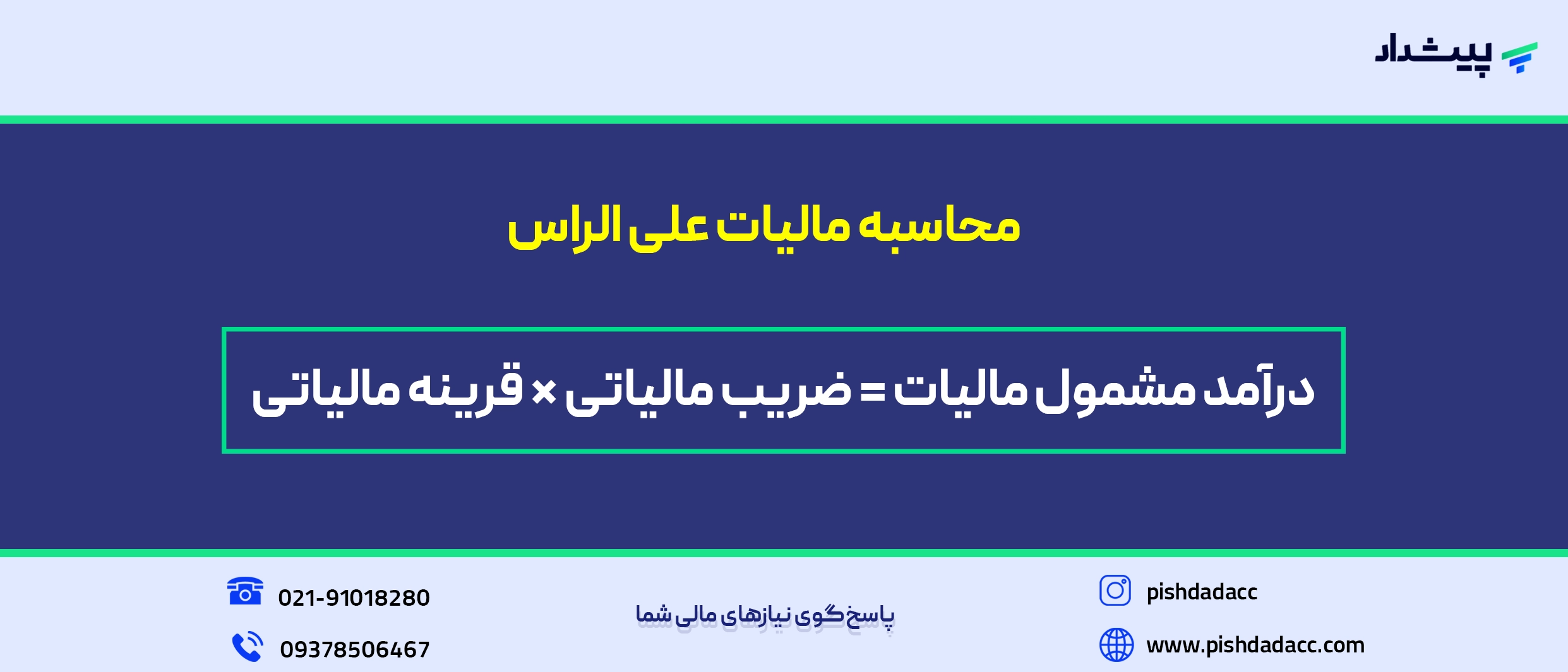 شما عزیزان می توانید از خدمات مالیاتی، خدمات حسابداری، مشاوره مالیاتی، مشاوره حسابداری و خدمات نرم افزاری شرکت پیشداد بهرهمند شوید؛ شماره تماس: 02191018280