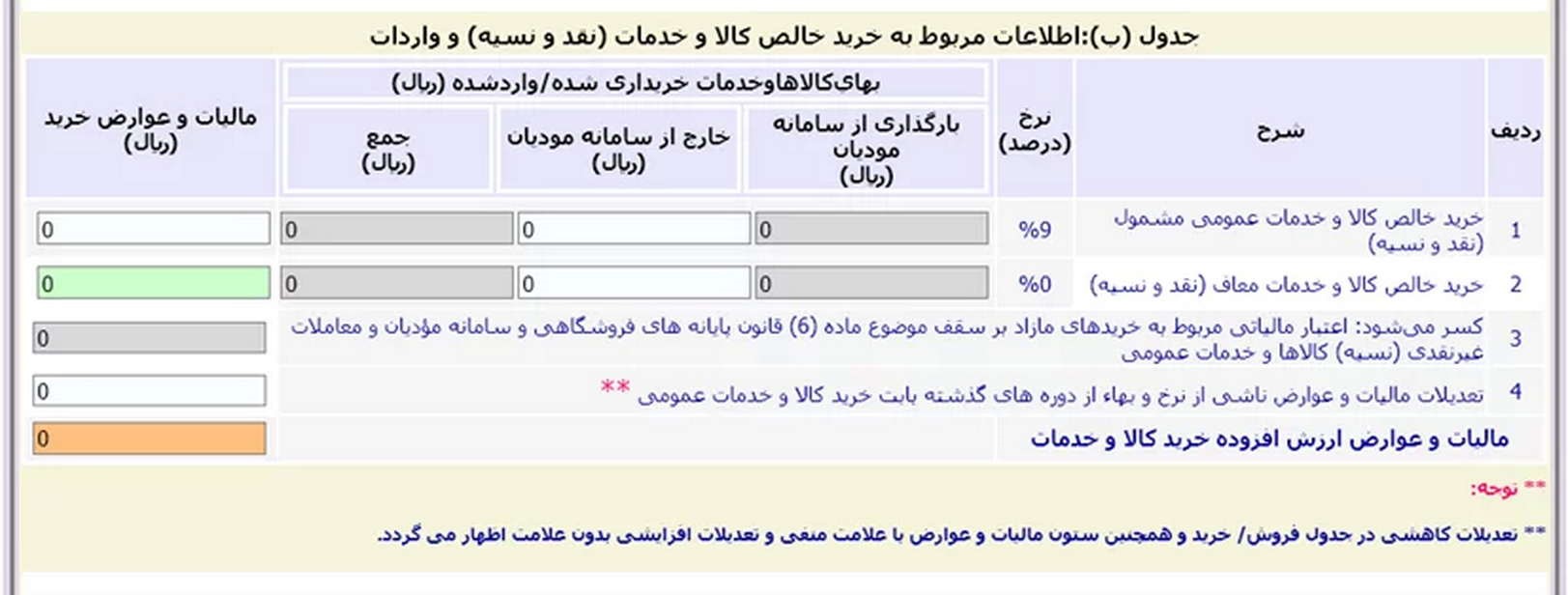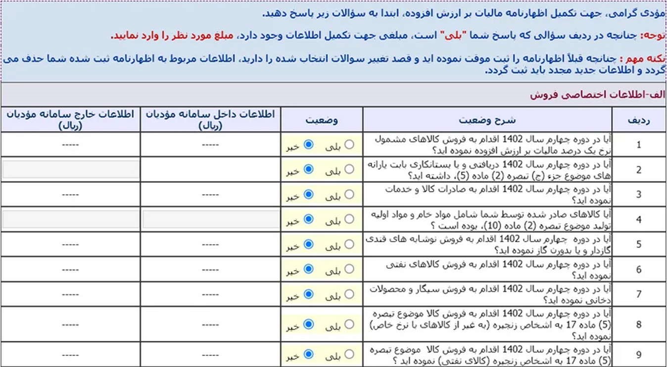 - پاسخ به سوالات جدول الف و ب: سوالات این جداول باید مطابق فعالیت کسب وکار شما تکمیل شوند. اگر فروش کالا و خدمات شما با نرخ عمومی انجام می شود و شامل واردات، صادرات یا کالاهای معاف نیست، گزینه “خیر” را انتخاب کنید.