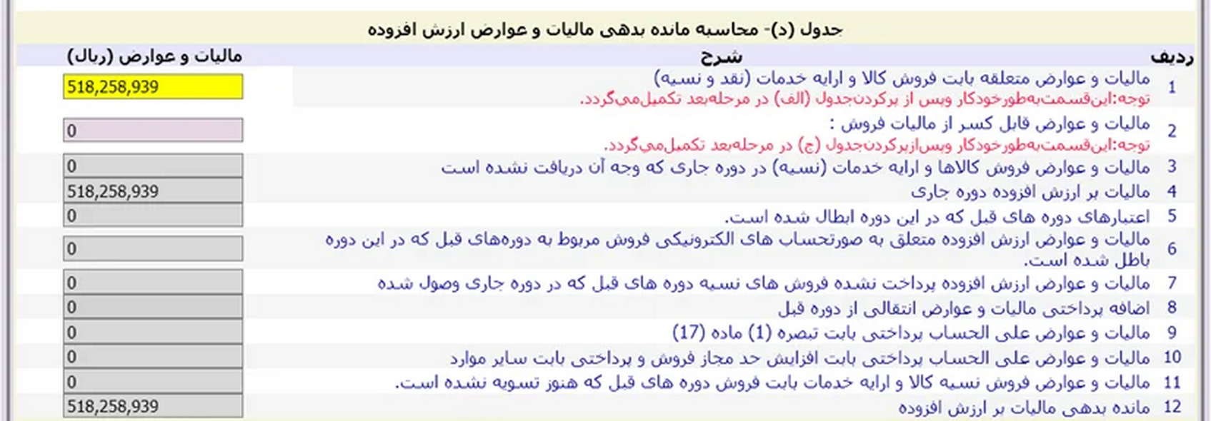 10 .محاسبه مالیات: سامانه مالیاتی، بدهی یا بستانکاری مالیات بر ارزش افزوده را بر اساس اطلاعات ثبت شده نمایش می دهد.