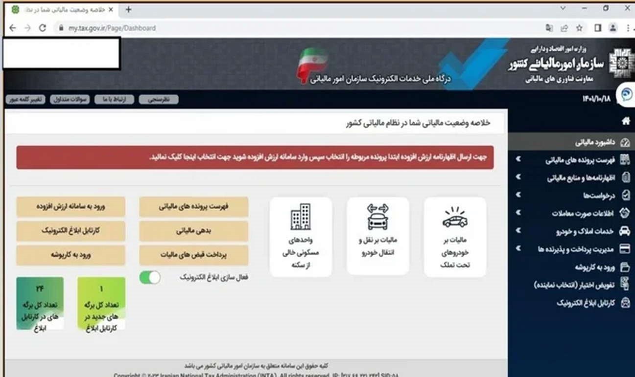 - ورود به سامانه: ابتدا با نام کاربری و رمز عبور وارد سامانه مالیاتی شوید.